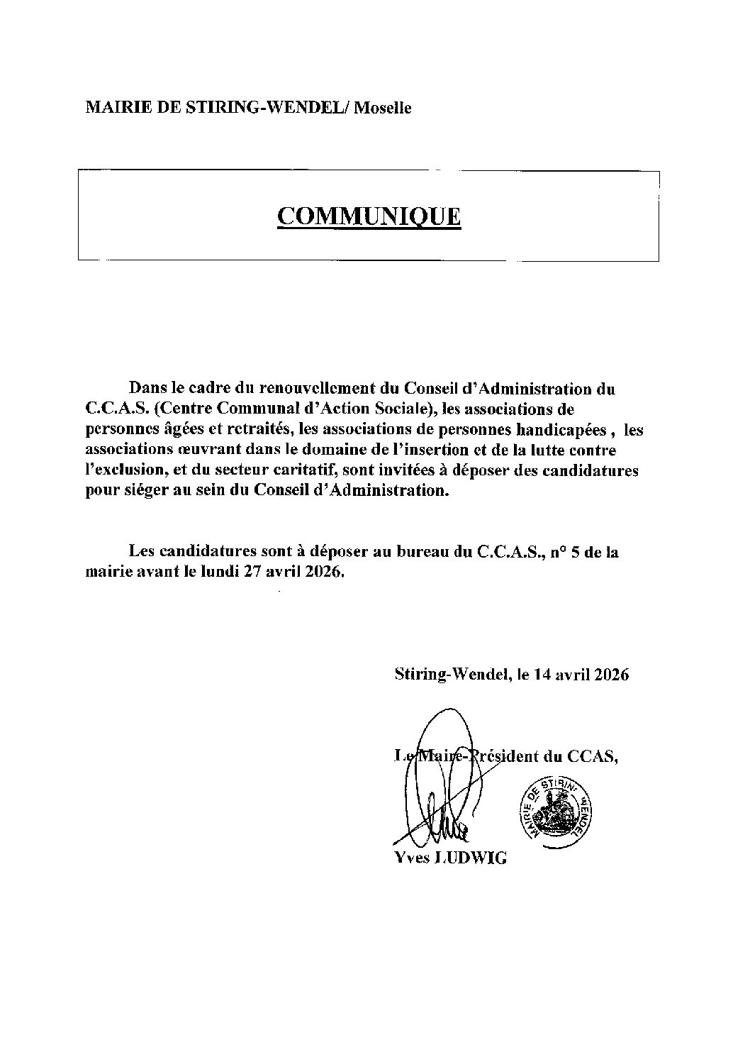 Dans le cadre du renouvellement du Conseil d’administration du Centre Communal d’Action Sociale (CCAS), la Ville de Stiring-Wendel lance un appel à candidatures à destination des associations locales.