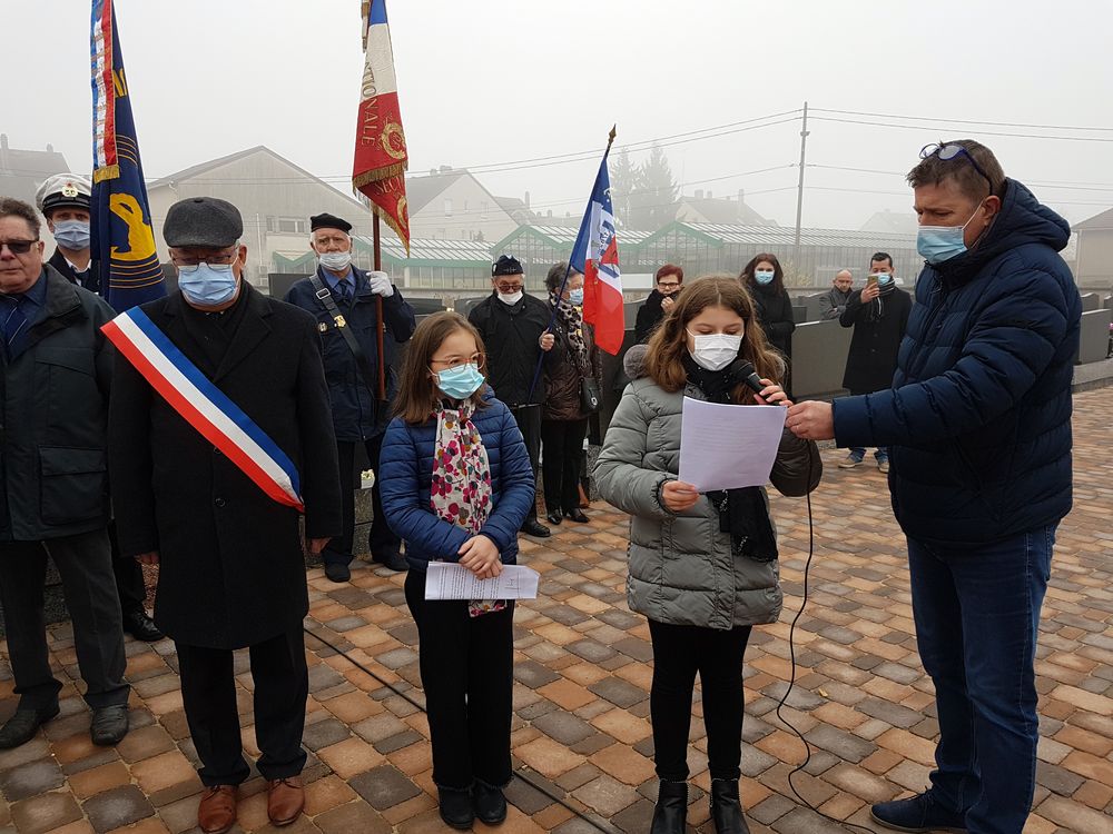 La cérémonie s’est achevée au cimetière du centre avec un dépôt de gerbes au pied du Monuments aux Morts et la lecture du message de Madame Geneviève Darrieussecq, Ministre déléguée auprès de la Ministre des Armées, chargée de la Mémoire et des Anciens Combattants par deux élèves de CM2 de l’école du centre.