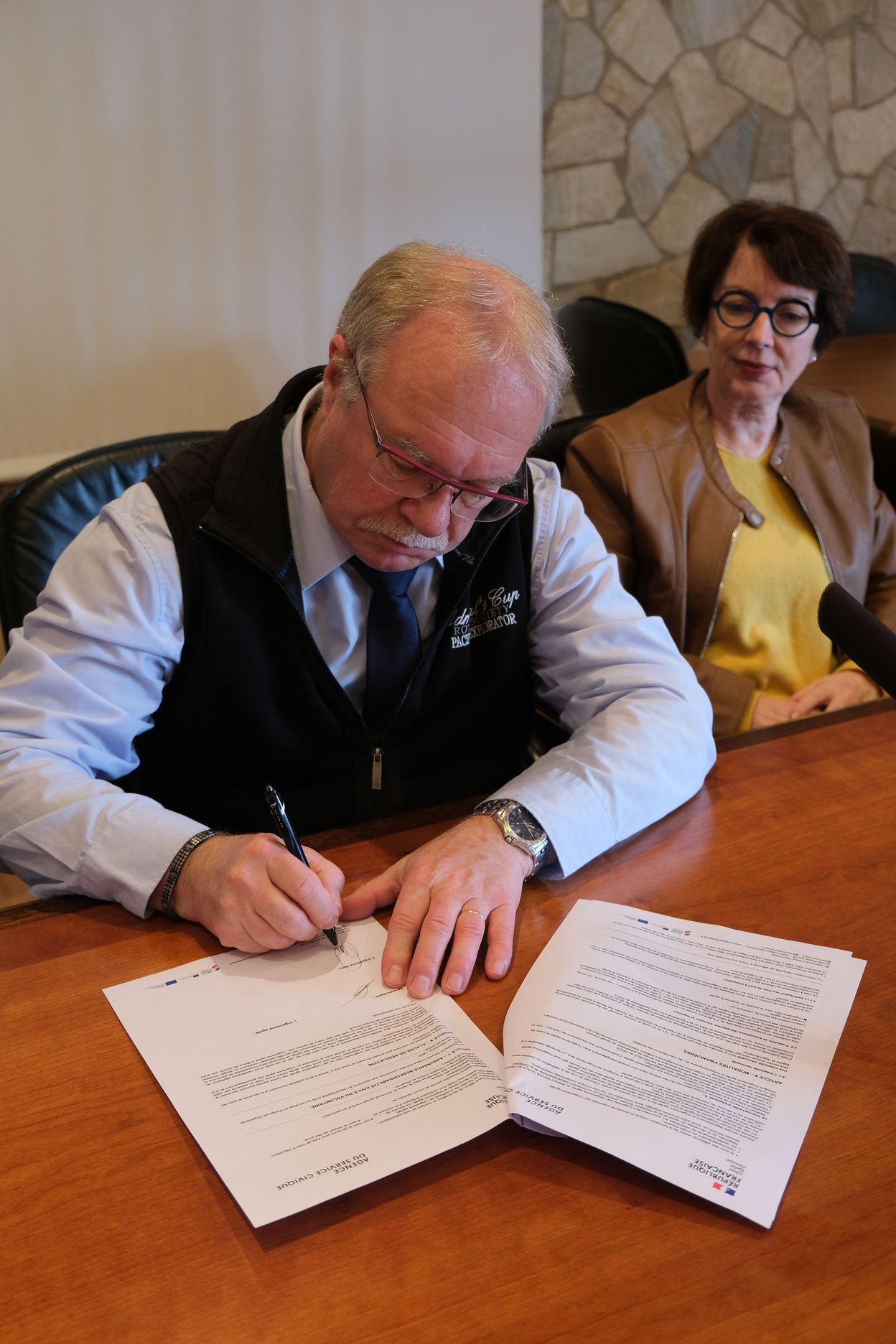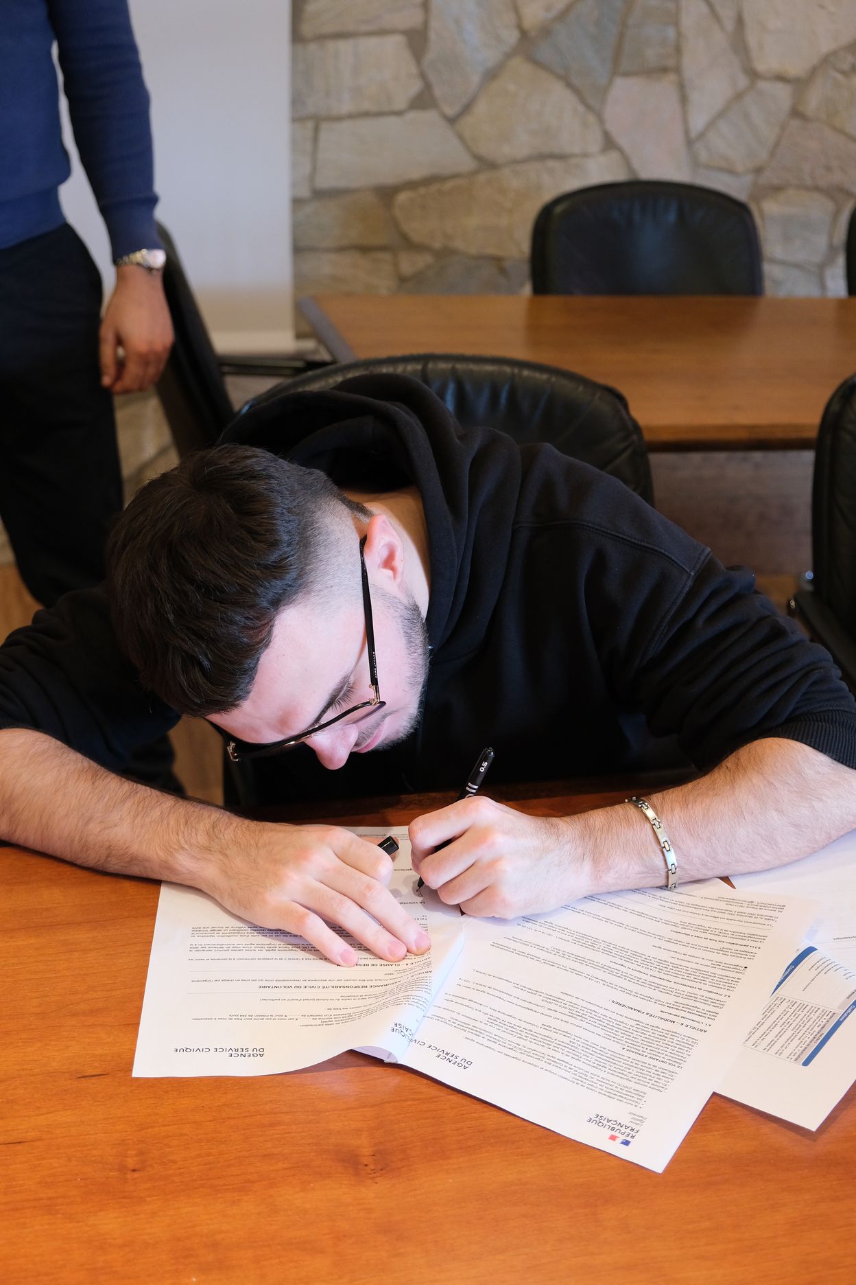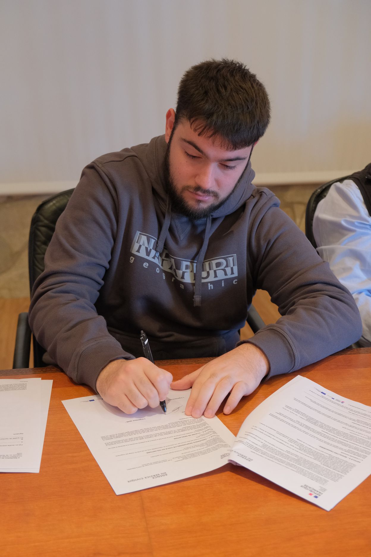 Jean-Pascal PETIT-ROUX, qui a intégré le dispositif par l’intermédiaire de la Mission Locale et Arnaud GLAESER, qui était stagiaire en mairie l’année dernière, ont signé leur contrat en présence de Xavier LEWANDOWSKI, chef de projet en charge du dispositif auprès du CDOS 57. « Le Comité Départemental Olympique et Sportif de la Moselle détient l’agrément. Nous agissons comme un intermédiaire et facilitons les démarches administratives pour les associations ou les collectivités souhaitant accueillir des jeunes en service civique. »