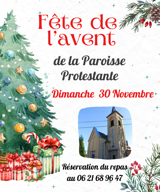La paroisse protestante de Stiring-Wendel invite à sa traditionnelle fête de l’avent qui aura lieu le dimanche 30 novembre au Foyer protestant de Stiring-Wendel.