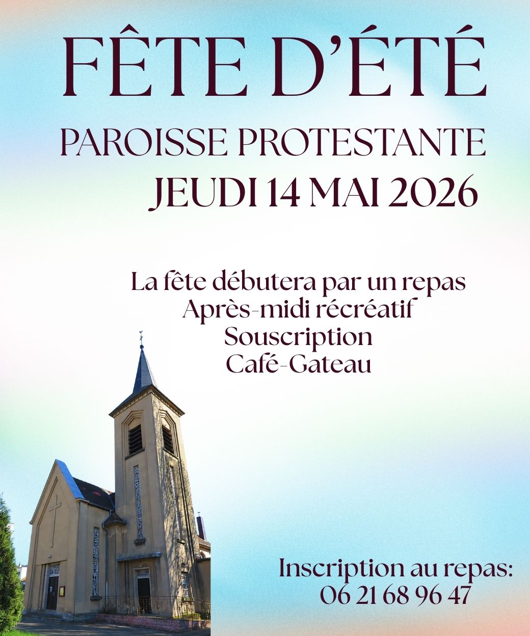 La paroisse protestante de Stiring-Wendel invite à sa traditionnelle fête de l’été qui aura lieu le jeudi 14 mai 2026 au Foyer protestant de Stiring-Wendel.