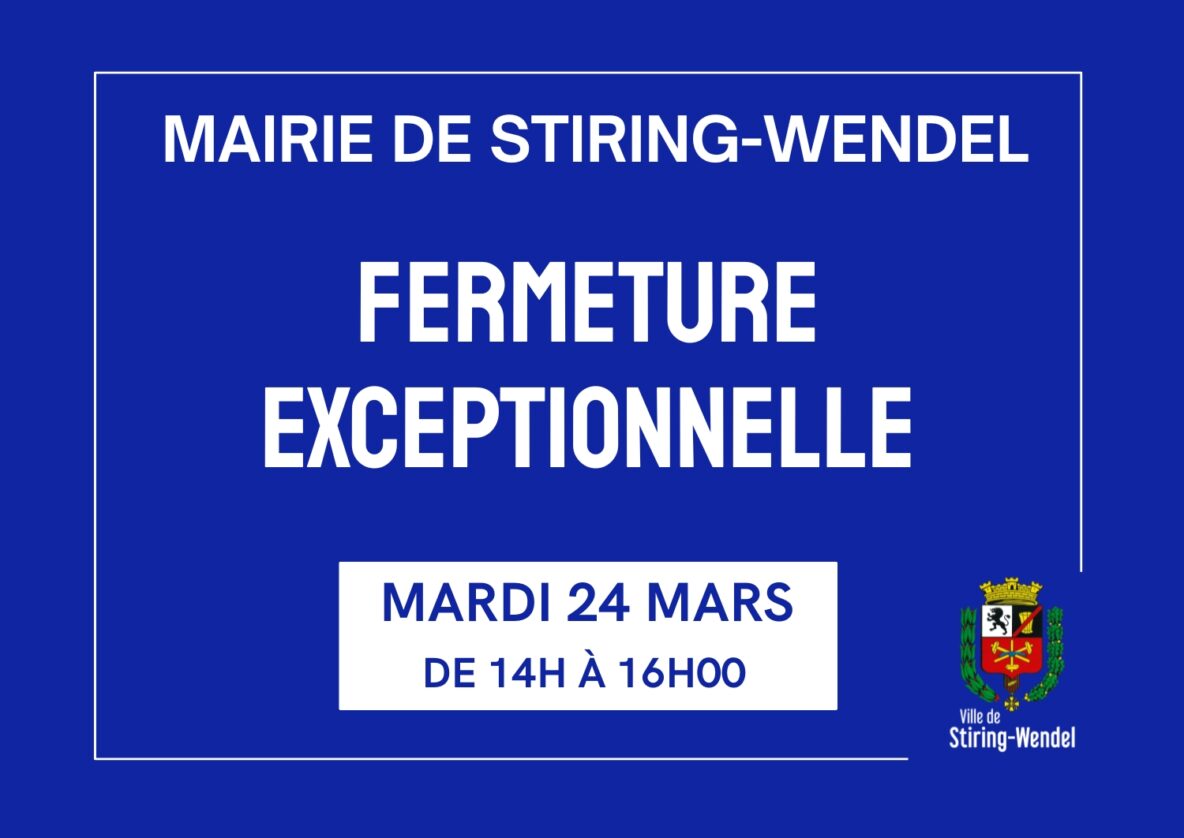 Fermeture de la mairie mardi 24 mars 14h à 16h Nous vous informons que la mairie de Stiring-Wendel sera exceptionnellement fermée demain, mardi 24 mars, de 14 h à 16 h. Merci pour votre compréhension.