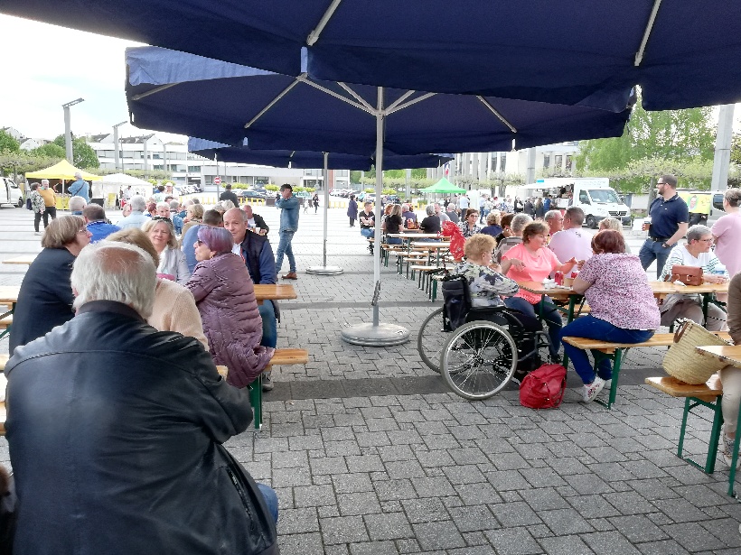 Un petit air de vacances planait sur la Place de Wendel. La météo clémente et la bonne ambiance ont attiré de nombreux visiteurs, prenant le temps de s’installer pour une petite restauration sur place.
