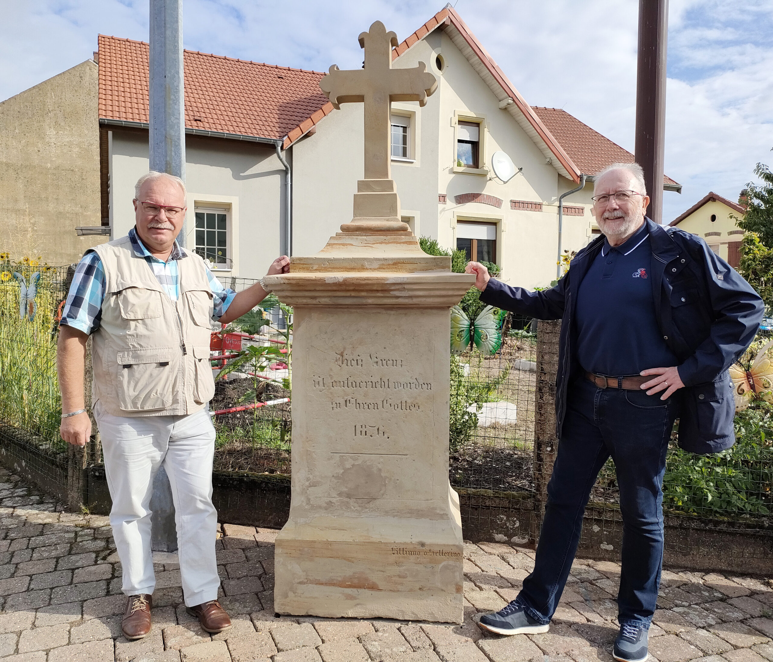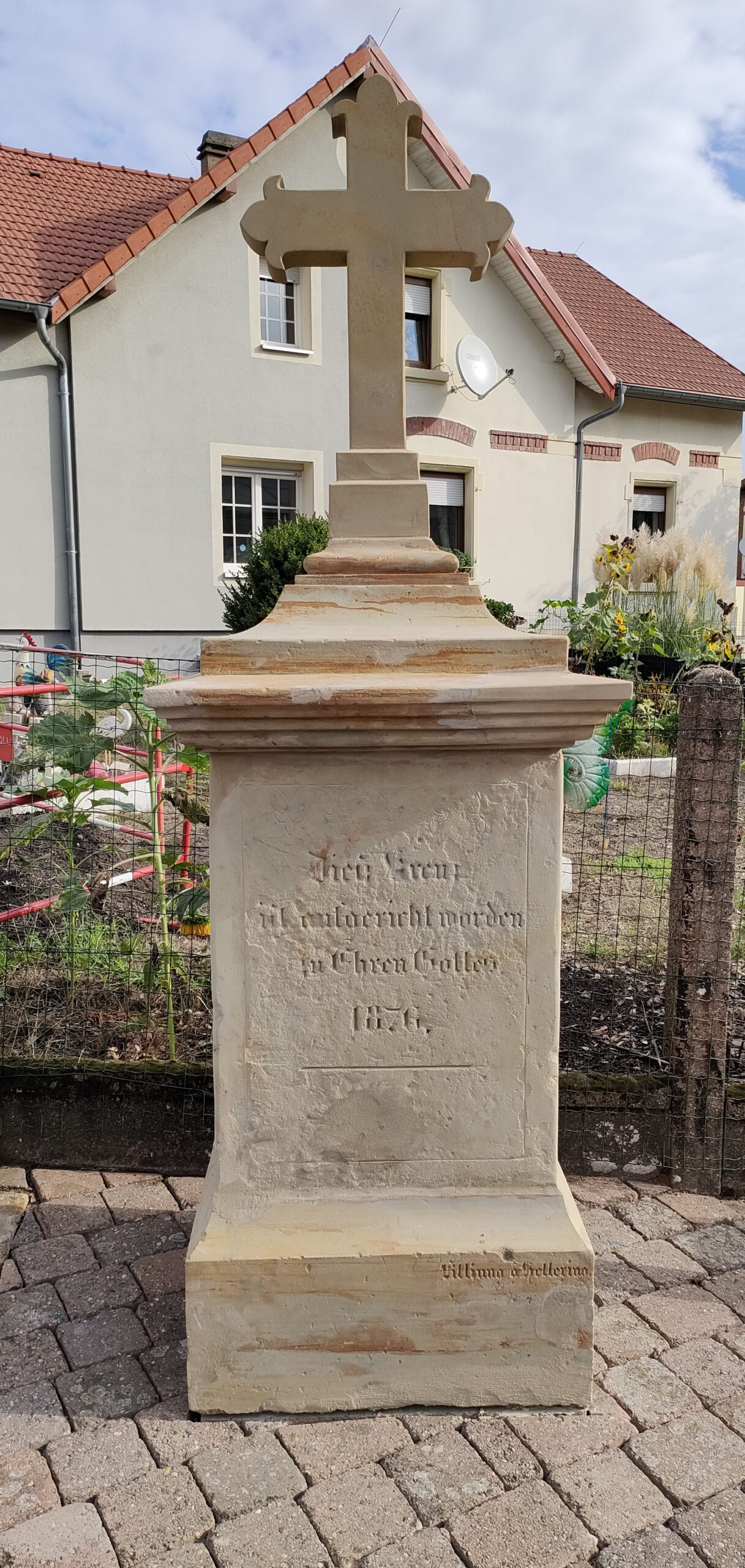 Érigée à la gloire de Dieu en 1876 par la famille HIRSCH Nicolas, en souvenir de l’épidémie de choléra de 1866, la croix avait du être déposée il y a quelques années en raison de son mauvais état.